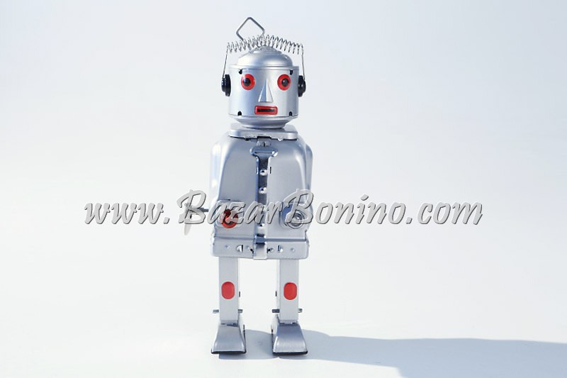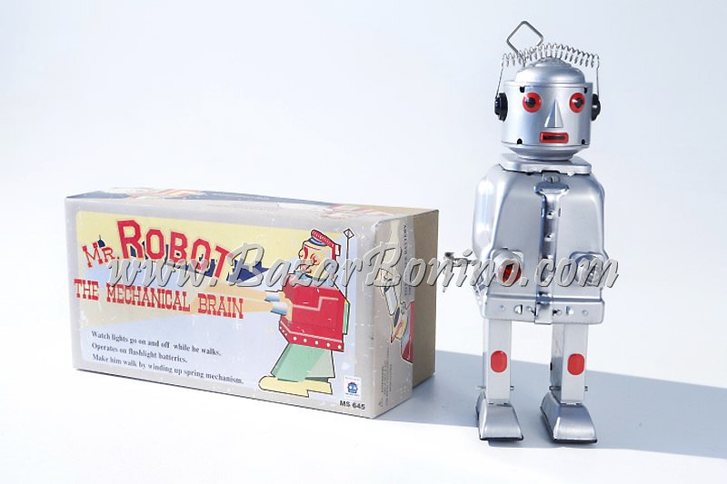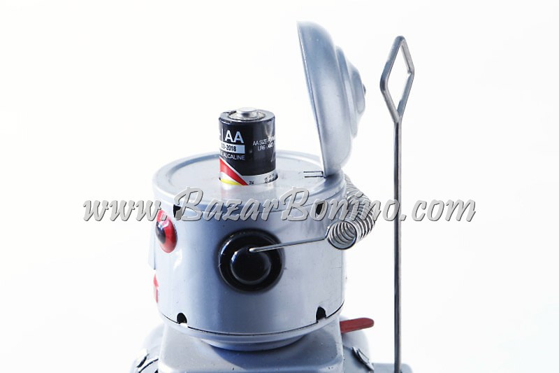 Fedele riproduzione del Mr. Robot in Latta THE MECHANICAL BRAIN Cm.21 Le mani luccicanti si accendono e si spengono mentre si muovono. Per prima cosa, devi mettere la barra di combustibile nucleare da 1,5 Volt nel cervello. Chiave a cerniera robusta! (WOW, come ai bei vecchi tempi) Start- Stop- interruttore nell’elemento posteriore! Qualità da HA-HA TOY!